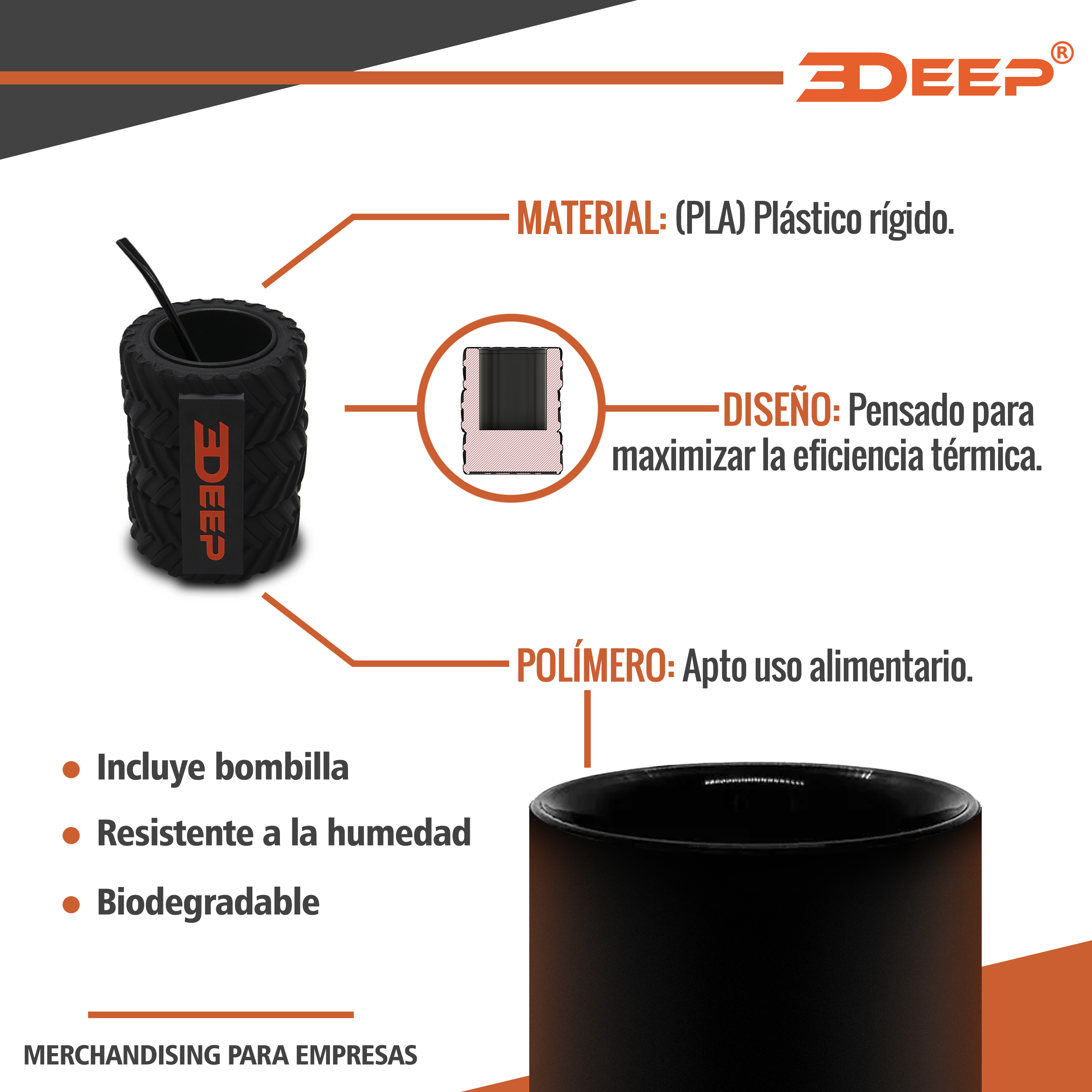 MATE RUEDA AGRO | MEDIDAS: 14 cm de alto x 10 cm de diámetro| EXTERIOR: hecho con plástico rígido | INTERIOR: lleva en el centro un accesorio que es removible apto para su uso alimentario